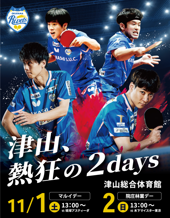 岡山リベッツでは、11月1日(土)・2日(日)に津山総合体育館で開催されるホーム公式戦の試合終了後、来場者の皆さまを対象に無料卓球教室とバックヤードツアーを実施いたします。